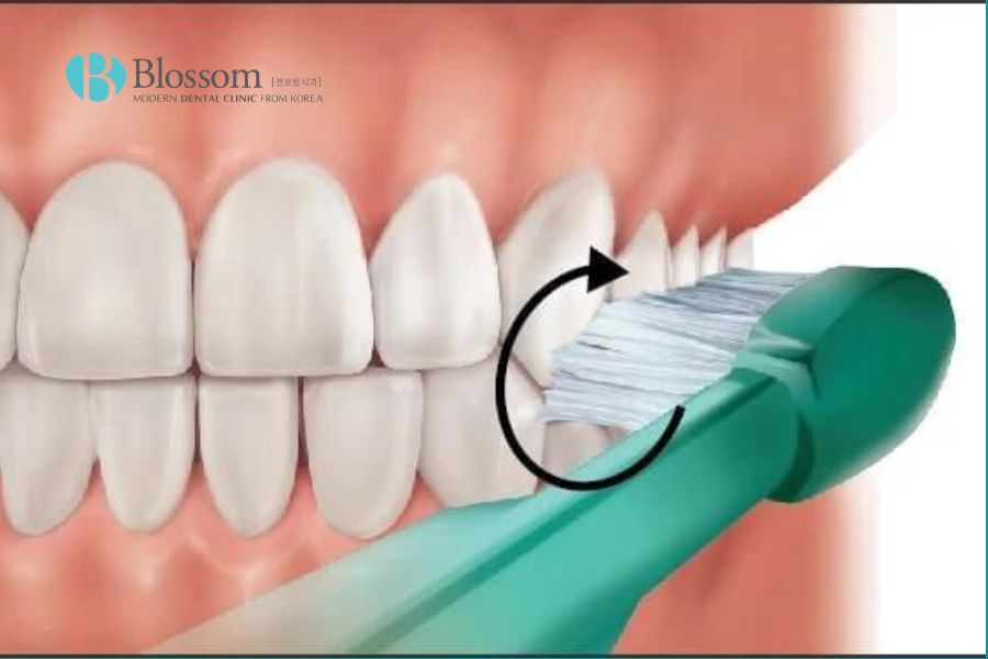 Chải răng chuyển động tròn nhẹ nhàng, bao gồm mặt ngoài, mặt trong và mặt nhai của răng.